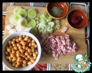 Мягкий нут сливаем через сито и кладем в миску, отвар сохраняем. Нарезаем бекон мелкими квадратиками, лук-порей нарезаем кольцами, сельдерей очищаем от верхнего волокнистого слоя и нарезаем кусочками, чеснок просто очищаем от шелухи, отсыпаем меру сухого розмарина и красного жгучего перца. У меня паста из острого красного перца.