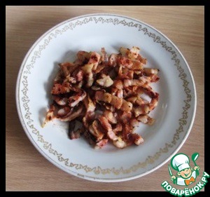 На сухой сковороде обжариваем ломтики бекона до коричневой корочки, откладываем на тарелку