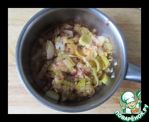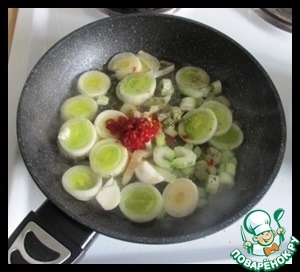 Наливаем в сковороду растительное масло и выкладываем лук-порей, сельдерей, чеснок, высыпаем розмарин и выкладываем острый перец, наливаем полстакана воды и тушим на малом огне до мягкости овощей