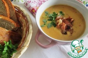 Разбавляем пюре горячим бульоном или кипятком до желаемой густоты и пробуем на соль. Особо не солите, жареный бекон достаточно соленый, не забывайте о нем.