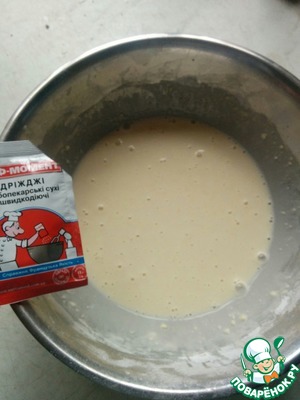 Затем вливаем теплое молоко и взбиваем чтобы не было комочков. Даем постоять минут десять и добавляем ложку растительного масла.
