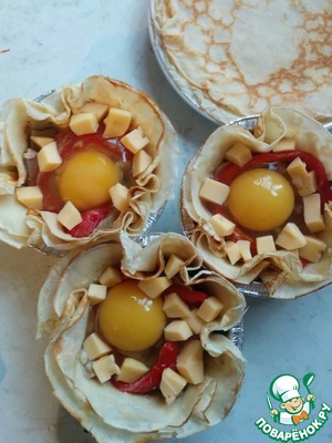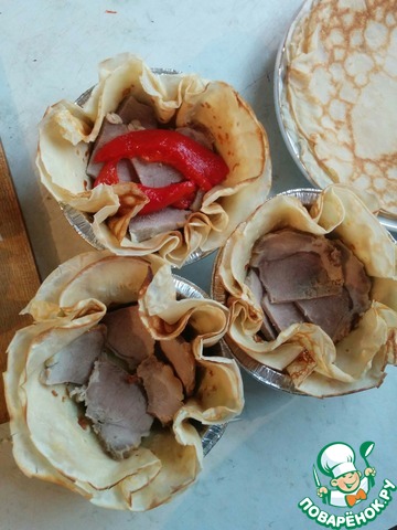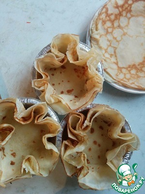 Берем формочки маленькие, у меня одноразовые из фольги. Выкладываем внутрь блинчики, я выкладывала сразу по два, а можно и по три.