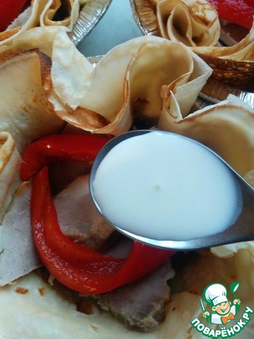 • Берем формочки маленькие, у меня одноразовые из фольги. Выкладываем внутрь блинчики, я выкладывала сразу по два, а можно и по три.