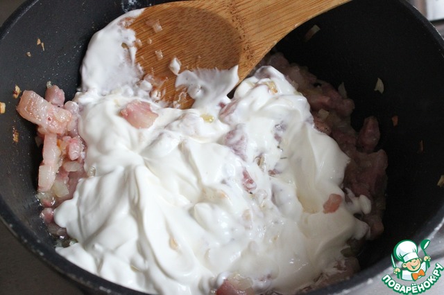 Затем добавляю сметану. Перемешиваю и прогреваю 1-2 минуты (так, чтобы сметана не кипела). снимаю с огня.