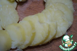 • Тем временем приготовим начинку. Картофель отварить в мундире, остудить, очистить и нарезать кружочками.