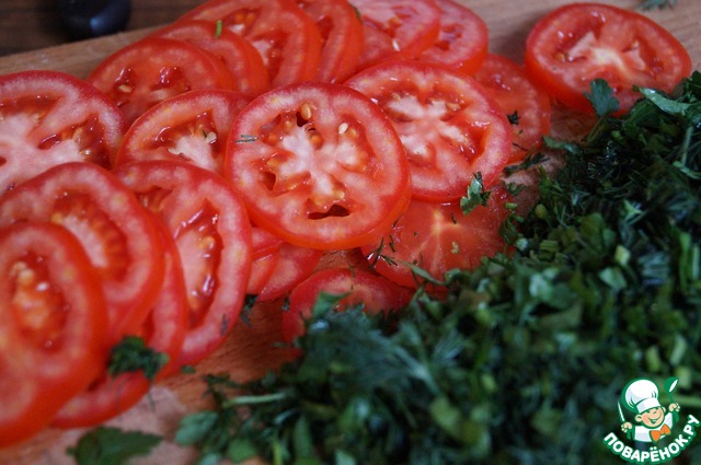 • Помидоры нарезать кружочками, зелень измельчить. (у меня петрушка и укроп)