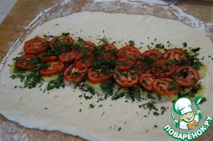 • Не большой кусочек теста оставить для украшения, а остальное тесто раскатать в прямоугольный пласт. Посредине выкладываем картофель, солим и перчим по вкусу, посыпаем зеленью и сверху выкладываем помидоры, солим и выкладываем оставшуюся зелень.