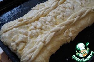 • Краями теста с двух сторон накрываем кулебяку и защипываем. Украшаем кулебяку фигурками из теста, на ваш вкус. Выкладываем кулебяку на смазанный противень и сверху смазываем яичным желтком. Чтобы кулебяку удобно было перекладывать на противень, лучше формовать её на пекарской бумаге. Но у меня все вышло и без неё)