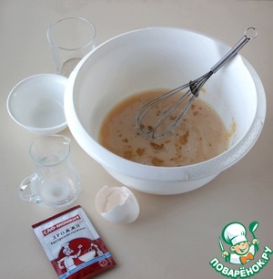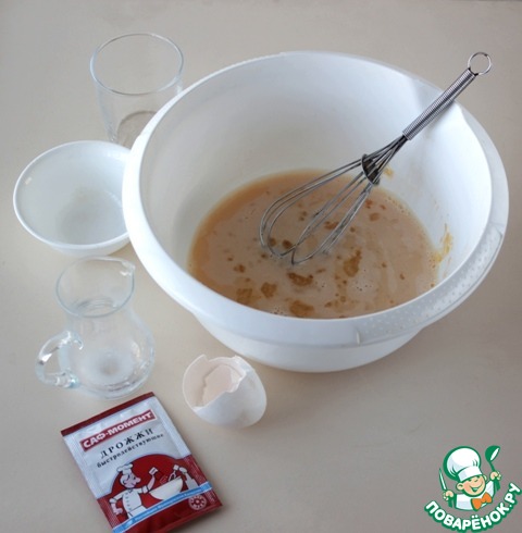 В большой миске смешать венчиком яйцо с сахаром и солью, влить теплые сливки и теплую воду, размешать, добавить растительное масло.