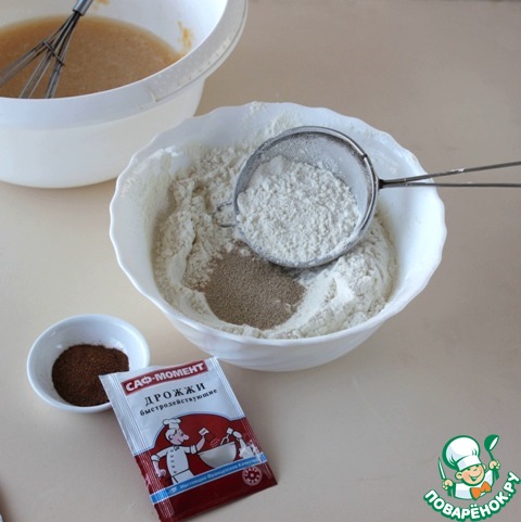 Просеять муку, насыпать сухие дрожжи Саф-момент, перемешать.