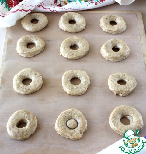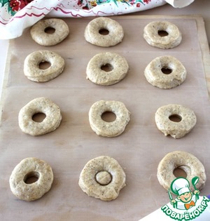 Раскатать тесто толщиной 1,5 см. Стаканом вырезать из теста кружки, а в них сделать отверстие при помощи горлышка пластиковой бутылки. Выложить на застеленную пергаментом поверхность, накрыть полотенцем на 1 ч.