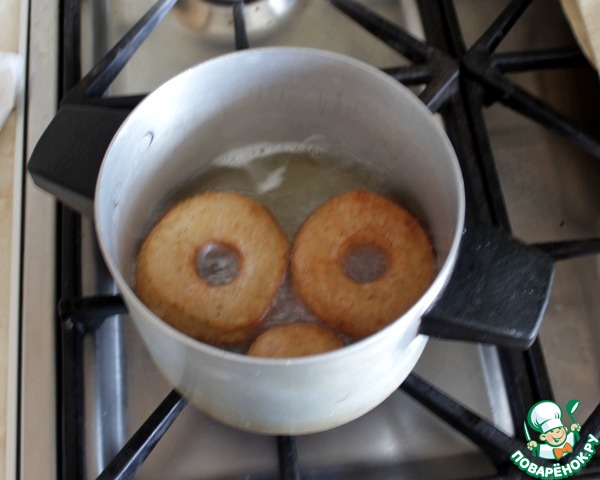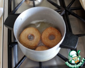 Пончики жарить в разогретом фритюре (растительном масле) до золотистого цвета по 1 мин с каждой стороны.
