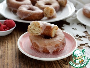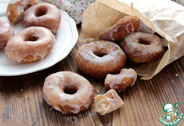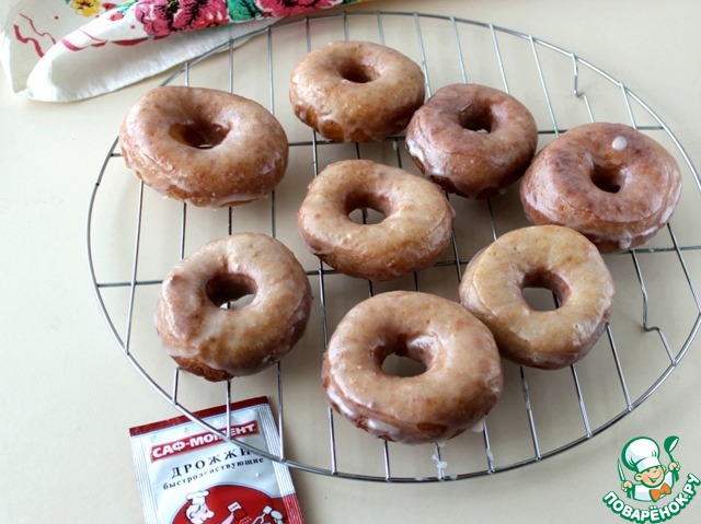 При желании пончики покрыть сахарной глазурью Для этого 1 стакан сахарной пудры смешать с 5-6 ст. л. ледяной воды, готовые пончики окунать в глазурь и выкладывать на решетку обсохнуть.