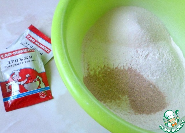 Просеять в миску муку, добавить сухие быстродействующие дрожжи ТМ САФ-МОМЕНТ, сахар, соль, перемешать венчиком.