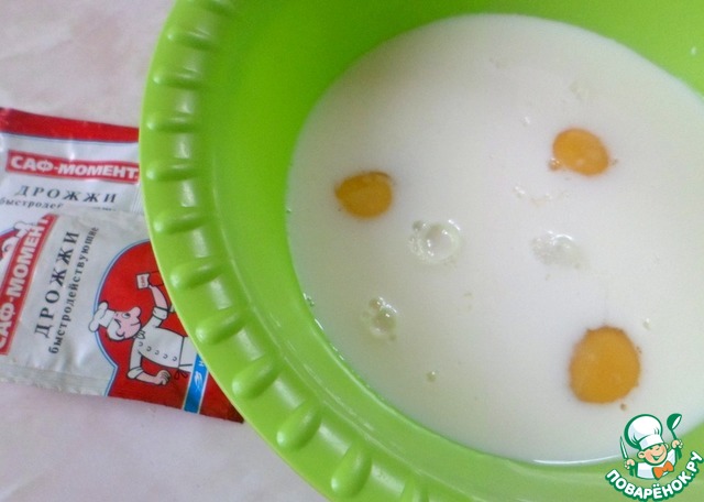 В теплое молоко с водой разбить яйца, хорошо все перемешать.