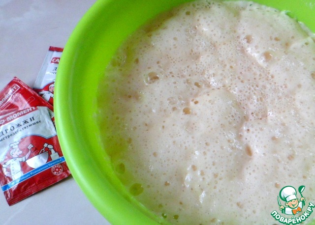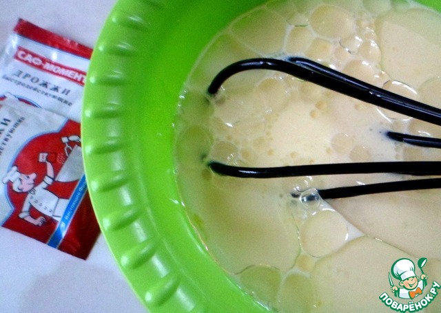 В сухие ингредиенты влить половину нормы жидкой смеси, перемешать хорошо, чтоб не было комочков. Затем вливать частями остальную молочно -яичную жидкость и перемешивать. Тесто накрыть пленкой и поставить в теплое место для подхода на 40 минут.