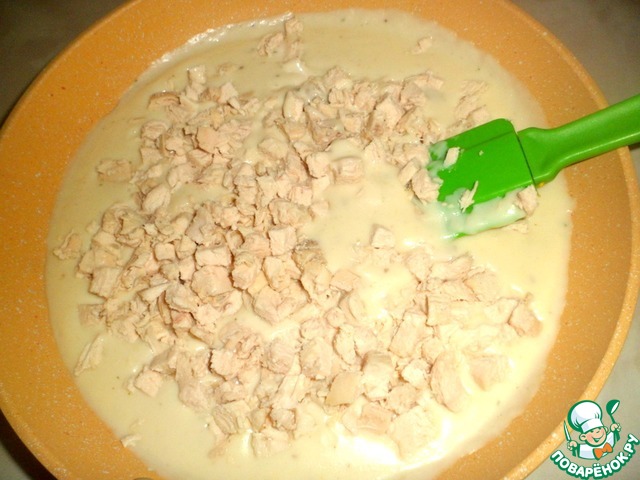 Приготовить соус: растопить на слабом огне сливочное масло, добавить к нему муку, быстро перемешивать венчиком несколько секунд и начинать вливать теплые сливки, чтоб получилась чуть жидковатая консистенция, так как это будет начинка, то сильно не разбавлять. Сливки могут остаться. Добавить соль, мускатный орех, смежемолотую смесь перцев. Добавить нарезанную на мелкие кусочки куриную грудку, перемешать.
