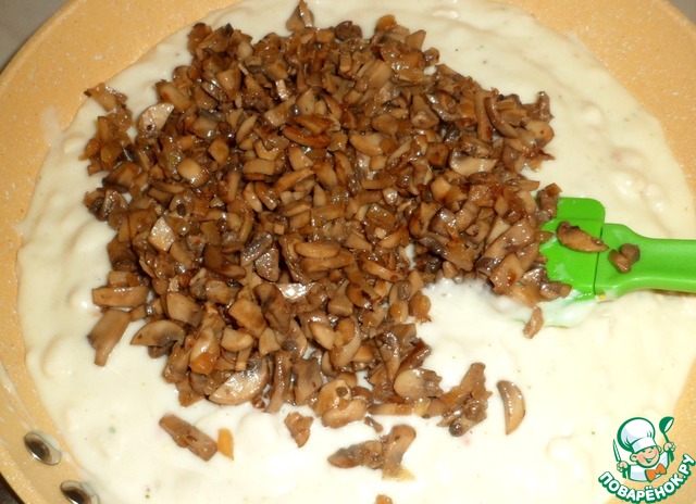 Добавить в сковороду жареные грибы с луком, перемешать.