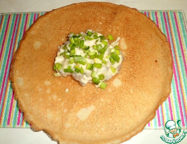 На каждый блин выкладываем столовую ложку жюльена, сверху присыпать зеленым луком. Собрать все края к центру, чтоб получился мешочек и завязать - перышком лука, где добавляли зеленый лук или ниточкой сыра -косичка, без добавления зеленого лука.