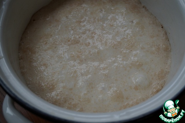 Оставить овсяно - молочную смесь с дрожжами и мукой в теплом месте на 15 минут. Должна подняться шапочка, которая пузырится, так сказать, "дышит".
