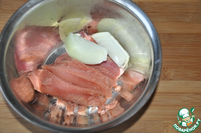 Берём рыбу лососёвых пород, у меня горбуша, чистим, разделываем на филе. Голову я отрезала для варки бульона.