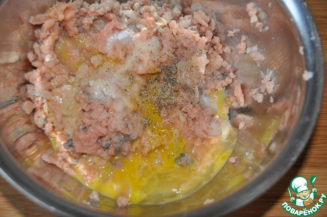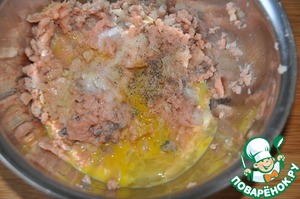 Добавляем в фарш яйцо, соль, смесь перцев.