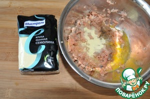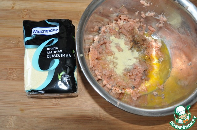 Кладём манную крупу, у меня Семолина от ТМ "Мистраль". Перемешиваем фарш.