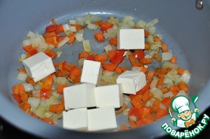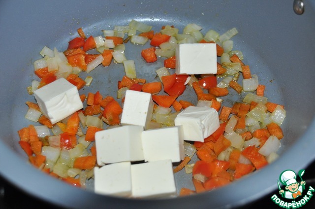 Берём сотейник или кастрюлю с толстым дном, на растительном масле обжариваем овощи пару минут на среднем огне, добавляем порезанный плавленный сыр.