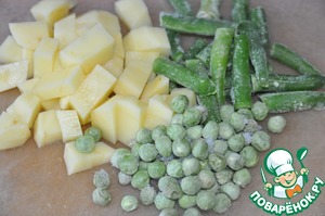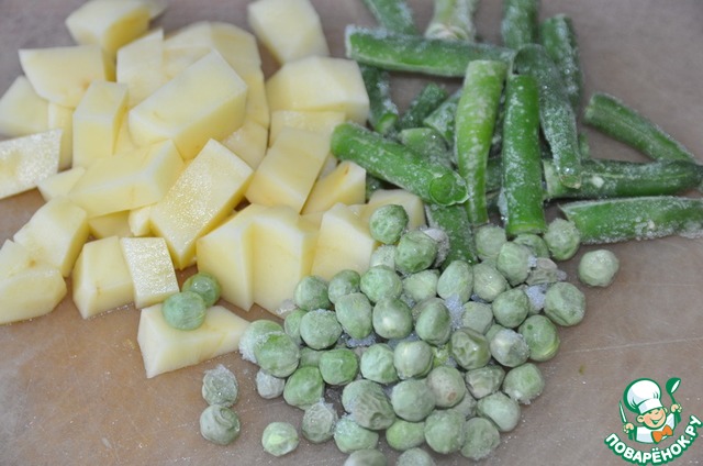 Берём стручковую фасоль, зелёный горошек, у меня овощи мороженные.