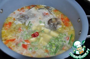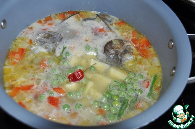 Кладём в суп картофель, горошек, стручковую фасоль, перец чили (по вкусу), солим. Доводим до кипения и варим 10 минут на медленном огне. -