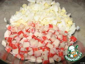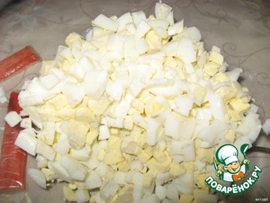 Яйца отвариваем, остужаем, очищаем, и режем кубиками.