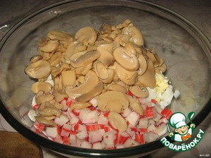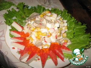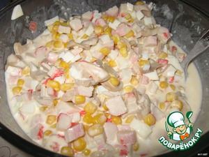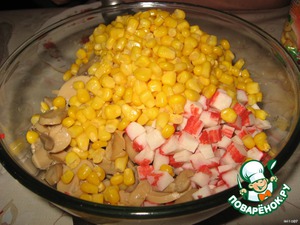 На мой взгляд очень органичное сочетание нежных варенных яичек, сладенькой кукурузы, ароматных крабовых палочек, и маринованных грибов из жестяной банки, которые то и вкуса особого не имеют.... а в этом салате пропитываются вкусами других продуктов и придают волшебную нотку... заставляя кружиться в танце все ингредиенты... В этом салате кукурузка и грибочки используются вместе с соком из баночек, пропитавшись, салат становиться просто необыкновенным.... сочным, ярким, нежным и ароматным... Быстрый, легкий и невероятно вкусный салатик!!! Все кто пробовал этот салатик всегда воспринимали его на УРА и уходили с рецептом...
