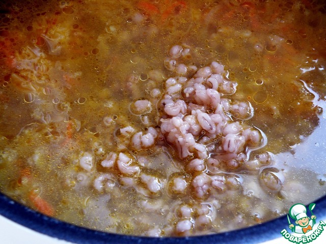 Залит овощи бульоном и довести до кипения. Выложить перловку, добавить кусочки мяса и снова довести до кипения.