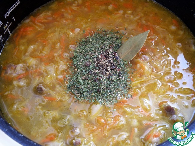 Затем выставить температуру 85 градусов, посолить и всыпать щепоточку сахара, добавить перец и сухие пряные травки и лавровый лист. Оставить щи упревать на час.