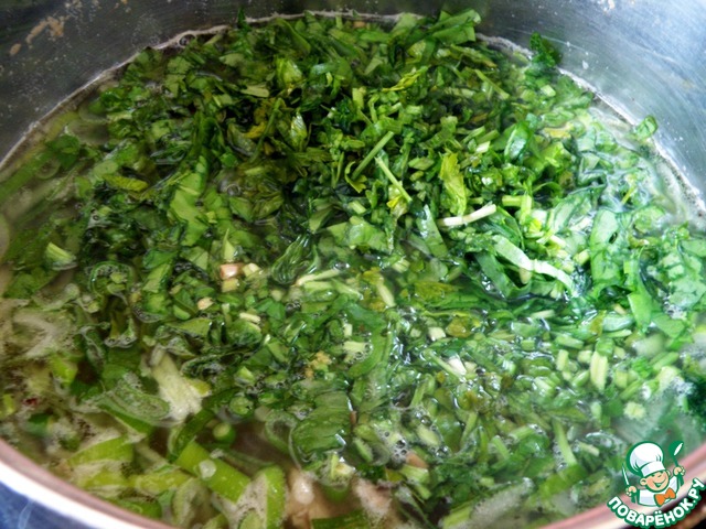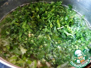 Опустить в суп мелко нашинкованные щавель и петрушку.