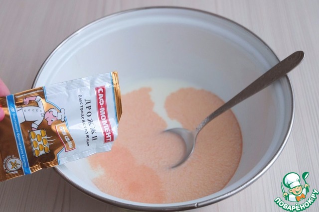 Молоко подогреть, добавить 6 г сухих быстродействующих дрожжей "Саф-момент", 2,5 ст. л. сахара. Смесь оставить на некоторое время для роспуска дрожжей.