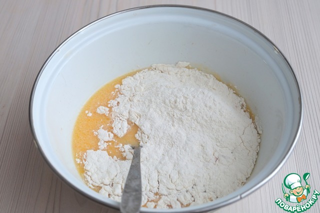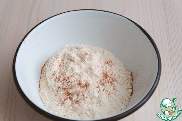 В миску с мукой добавить кардамон (1/3 ч. ложки), добавить мускатный орех (1/3 ч. ложки). Смесь перемешать.