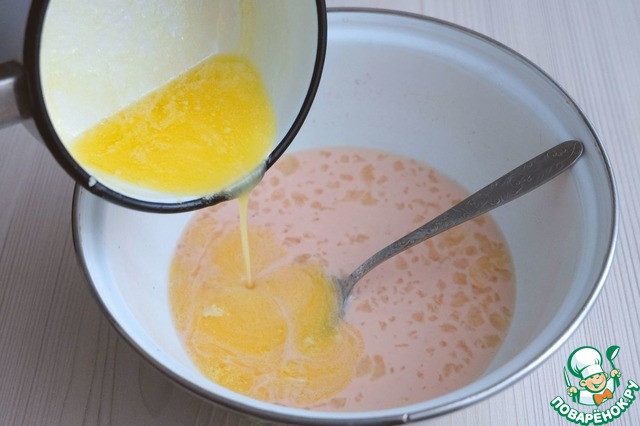 Сливочное масло (80 гр.) растопить, остудить до комнатной температуры, добавить в молочно-дрожжевую смесь.