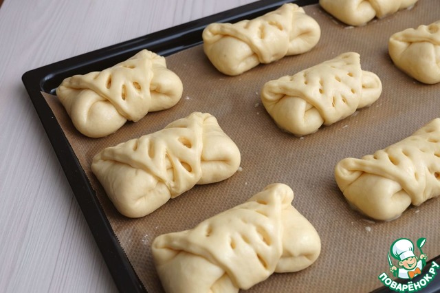 Готовые сформованные булочки-конвертики выложить на противень, застланный пекарской бумагой. Поставить булочки на расстойку на 15-20 мин., накрыв их куском ткани или полотенцем, далее булочки смазать взбитым яйцом и отправить в разогретую до t180-190С духовой шкаф для выпекания. Выпекать до золотистого цвета.