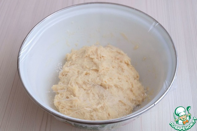 Замесить тесто. Тесто накрыть пищевой пленкой или полотенцем и поставить в теплое место для подъема.