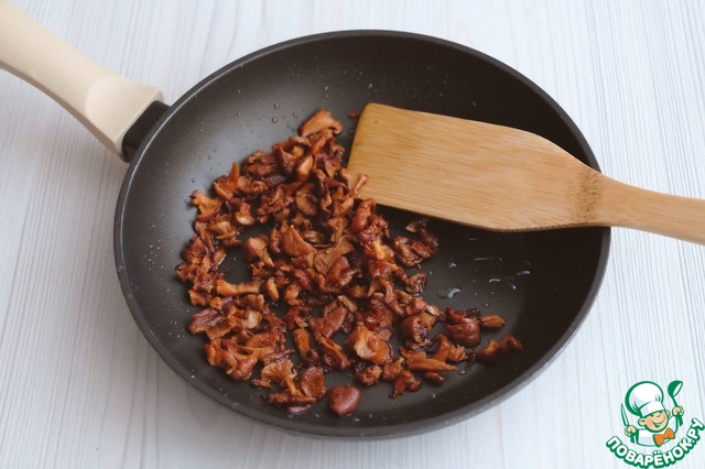 Грибы (лисички), можно использовать любые другие, нарезать некрупными кусочками. Добавить на сковороду растительное масло (3 ст. ложки), тушить грибы на слабом огне до готовности (примерно 30-40 мин.).