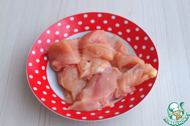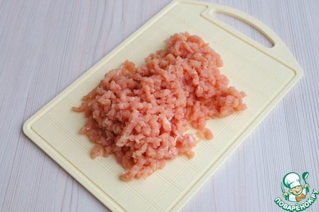 Пропустить куриное филе через крупную решетку мясорубки или нарезать мелкими кубиками.