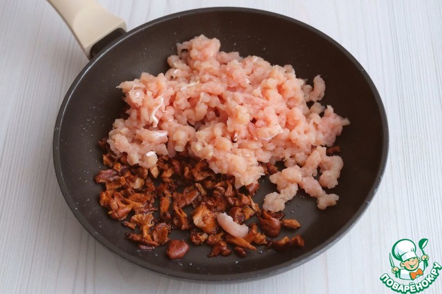 На сковороду добавить куриный фарш, добавить бульон (1/2 стакана или воду). Смесь посолить, добавить черный молотый перец по вкусу.