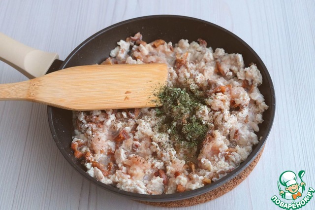 Добавить пряную сушеную зелень (1/2 ч. ложки). Сковороду с фаршем поставить на медленный огонь, тушить до готовности и выпаривания жидкости.