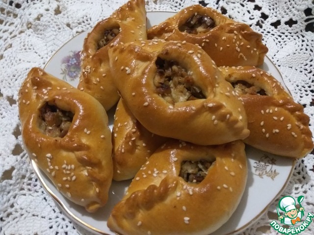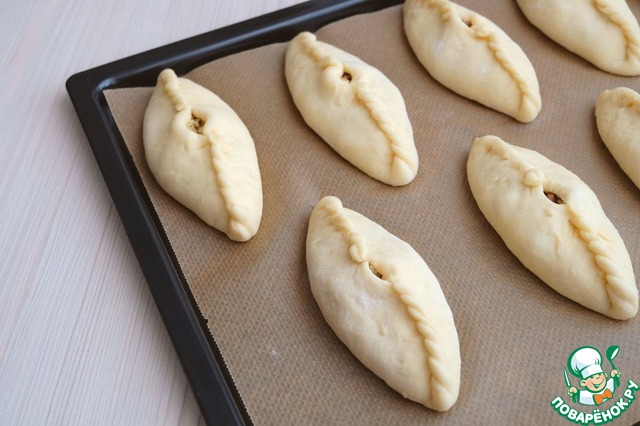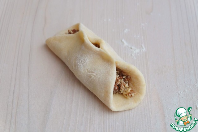 Тесто разделить на равные кусочки, примерно по 60 гр, сформовать лепешки, выложить приготовленный фарш на середину каждой лепешки, края соединить, оставляя в центре небольшое отверстие.