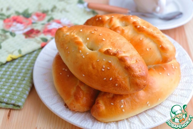 Расстегаи выложить на противень, застланный пекарской бумагой, дать расстояться 20-25 мин., затем смазать взбитым яйцом, посыпать кунжутом и отправить в разогретый до 180*С духовой шкаф. Выпекать до красивой румяной корочки.