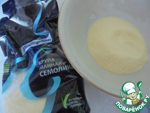 • Манную крупу залить 100 мл кипятка, посолить по вкусу добавить мелко рубленую зелень.