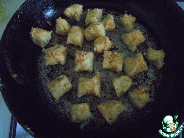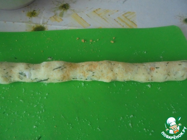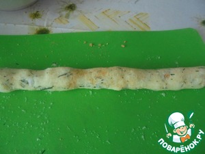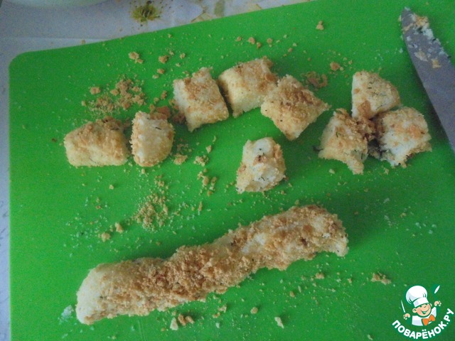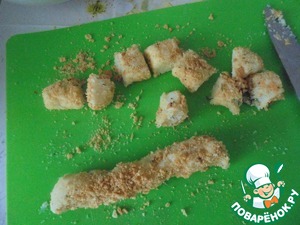 • Обвалять манный жгут в панировочных сухарях. Нарезать на небольшие кусочки.