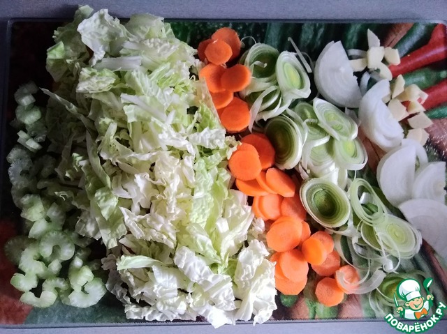 Подготовим ингридиенты. Сельдерей режем кружочками, пекинскую капусту крупно рубим, морковь-кружочками, порей-аналогично, лук-полукольцами, чеснок-дольками. Фасоль я отварила заранее почти до готовности. Бульон сварила заранее.