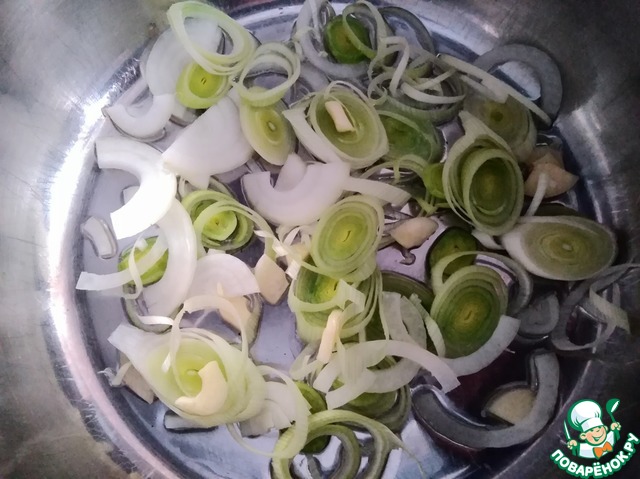 В кастрюле с толстым дном нагреваем масло и обжариваем лук, лук-порей и чеснок.